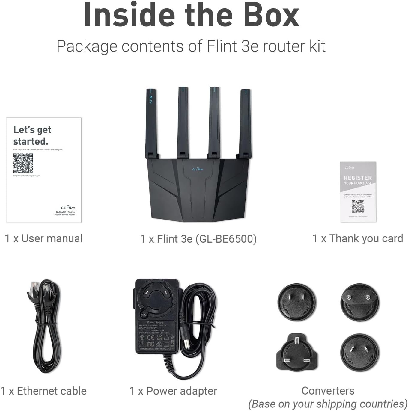 | Included Components | Ethernet cable, Flint 3e (GL-BE6500) router, Power adapter, User manual |
